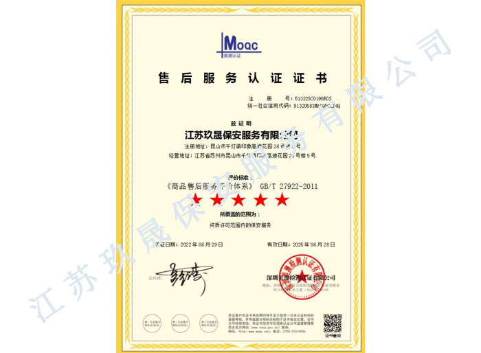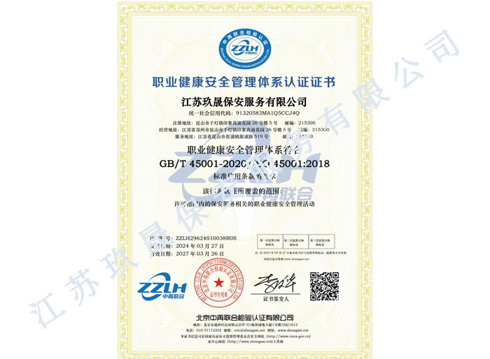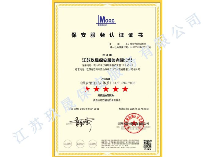 江蘇玖晟保安服務(wù)有限公司成立于江蘇省昆山市千燈鎮(zhèn)。注冊(cè)資金:5000萬,是擁有省公安廳頒發(fā)的保安服務(wù)許可證的企業(yè)【蘇公保服20170046】,也是昆山市保安協(xié)會(huì)常務(wù)理事單位。